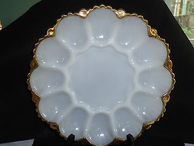 Vintage10" White Milk Glass Deviled Egg Serving Plate Dish with Gold Trim