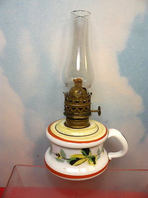 Title (ebay affiliate link): 2PC ANTIQUE BRISTOL ART GLASS HAND PAINTED MILK GLASS MINIATURE OIL LAMP