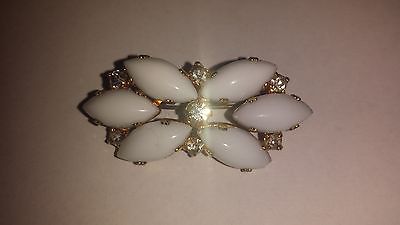 Vintage milk glass & rhinestone gold tone floral brooch pin