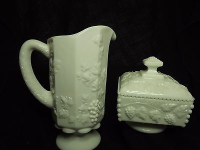 WESTMORELAND MILK GLASS GRAPE CLUSTER 8 INCH PITCHER & LIDDED CANDY DISH