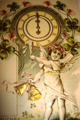 Title (ebay affiliate link): OLD NEW YEAR postcard ANGEL Antique Clock CLOVERS 1906