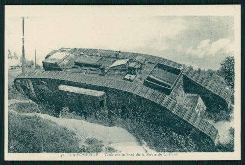 Title (ebay affiliate link): France Pompelle tank on Chalons road WWI ww1 war original old c1915 postcard