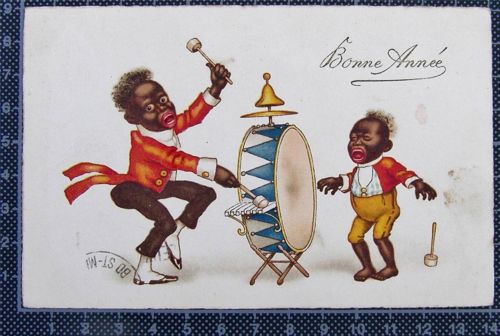 Title (ebay affiliate link): PP 1930's New Year Postcard: Black Man Playing Drums, Child Crying
