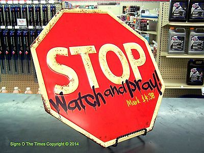 Title (ebay affiliate link): Stop Watch and Pray Mark 14:38 Street Sign 3D Embossed Metal Vintage Looking