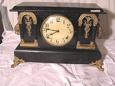 ANTIQUE GILBERT 257 MANTEL CLOCK 11 INCHES ALL, 17 INCHES WIDE WITH PENDULUM