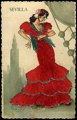 Title (ebay affiliate link): Vintage 1950's Postcard Embroidered Silk Spanish Lady Dancer in Red Sevilla