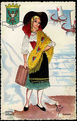 Vintage 1950's Postcard Embroidered Silk Portuguese Lady Aveiro Portugal