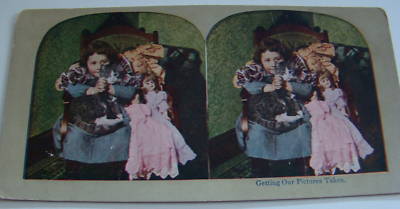 GIRL WITH OLD DOLLS & CAT ANTIQUE STEROVIEW CARD