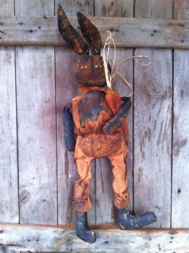 Title (ebay affiliate link): Primitive folk art black bunny rabbit doll with his carrot homespun overalls