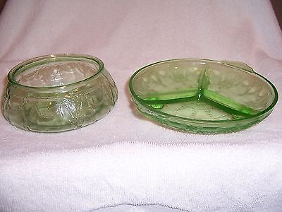 LOT OF 2 1930'S GREEN DEPRESSION CAMEO BALLERINA DIVIDED RELISH DISH CANDY JAR