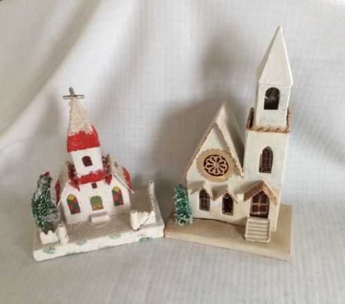 Title (ebay affiliate link): 2 Putz Style Christmas Village Houses Churches Made in Japan Mica