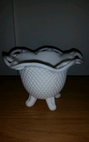 Title (ebay affiliate link): Four Footed Milk Glass Bowl Imperial Glass Laced Edge Diamond Pattern
