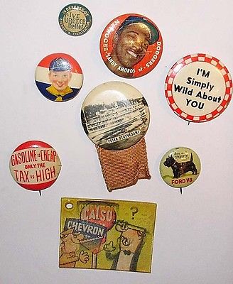 Title (ebay affiliate link): 7 Vntg Pinbacks, Scouts, Ford V8, Hudson Riverboat, Bklyn Dodgers + Chevron Tag+