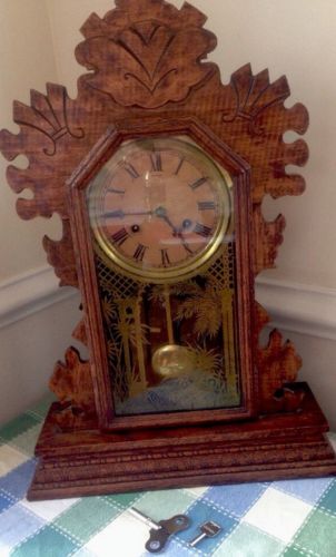 Title (ebay affiliate link): Antique Wooden Mantel Winding Pendulum Clock Victorian Gingerbread