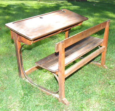 Title (ebay affiliate link): RARE Antique DOUBLE School DESK & BENCH Oak Iron! TWINS