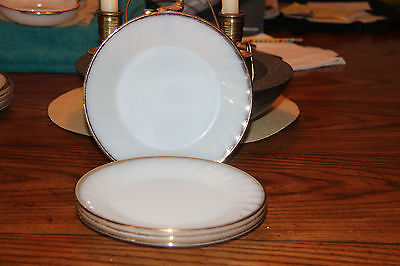 4 Vintage Fire King salad plates - milk glass with swirl pattern and gold trim