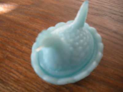 Title (ebay affiliate link): Vintage miniature Hen on Nest/Basket trinket box, blue milk glass, 2.5" 2 pieces