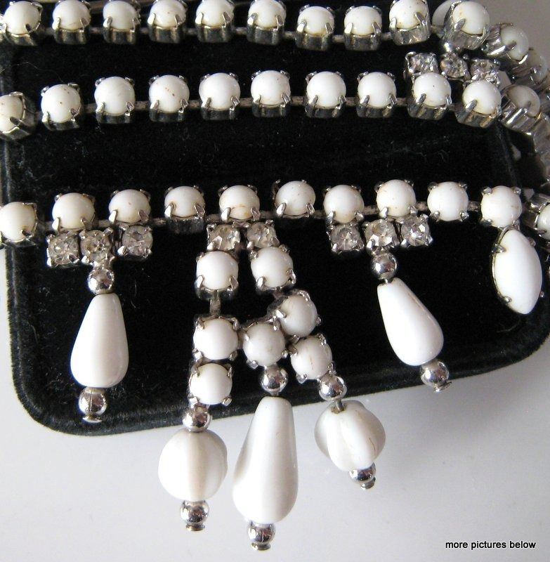Vintage Necklace WHITE MILK GLASS Clear Crystal Rhinestone Choker Silver tone