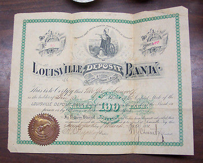Title (ebay affiliate link): OLD-ANTIQUE-1891 Louisville Deposit Bank Shares paper-Geo.Langolf-Laugolf KY