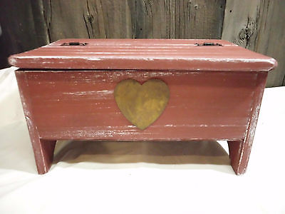 FarmHouse Red Hinged Top Storage Bench Rusty Tin Heart Primitive Rustic USA Made