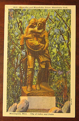 VINTAGE LINEN POSTCARD HIAWATHA AND MINNEHAHA STATUE MINNEAPOLIS, MINNESOTA