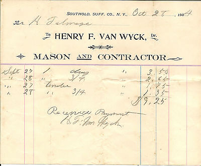 Title (ebay affiliate link): Southold, NY Billhead 1904 HENRY F. VAN WYCK Mason and Contractor