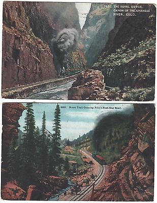 2 1914 Postcards Colorado Railroad Train Burro Trail and Royal Gorge by River