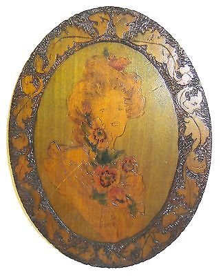 Antique 1909 Pyro Art Picture PYROGRAPHY Victorian Woman Florentine Panel Wood