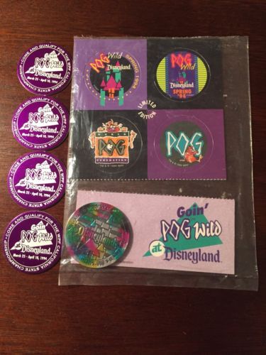 Title (ebay affiliate link): Goin Pog Wild @ Disneyland 1994! Rare Pog Set W/Bonus 4 Purple WPF Champs Pogs
