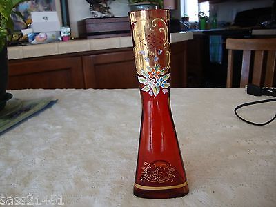 RED HAND PAINTED WITH FLOWERS AND GOLD TRIM VASE, MARY GREGORY?