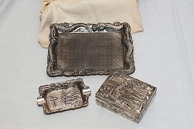 Vintage occupied Japan Tobacco Set, Metal 3 Piece Cigarette case Etched Dragons