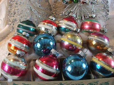 Title (ebay affiliate link): VINTAGE BOX SHINY BRITE BLUE PINK RED STRIPED CHRISTMAS ORNAMENTS SM SZ AT 2"