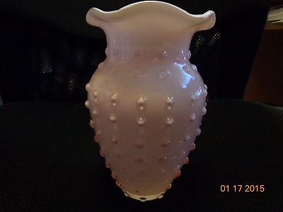 FENTON HOBNAIL(7in.) PINK AND MILK GLASS WHITE BLOWN VASE WITH RUFFLED EDGES