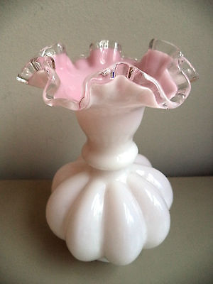 Title (ebay affiliate link): FENTON WHITE MILK GLASS-PINK INTERIOR VASE-Double Crimped Ruffle CRYSTAL EDGE