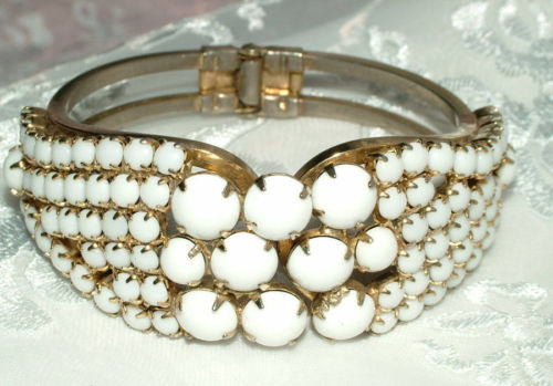 Title (ebay affiliate link): Vintage White Milk Glass Rhinestone Unsigned Gold tone Clamper Clamp Bracelet