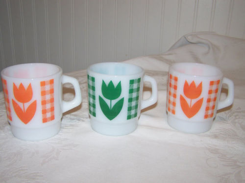 Title (ebay affiliate link): 3 Vtg Retro Milk Glass Stackable Mugs Termocrisa Tulip Gingham Flower Excellent