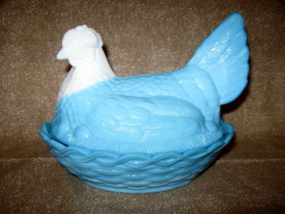VINTAGE CENTRAL GLASS CO. 7" HEN ON NEST,BLUE MILK GLAS