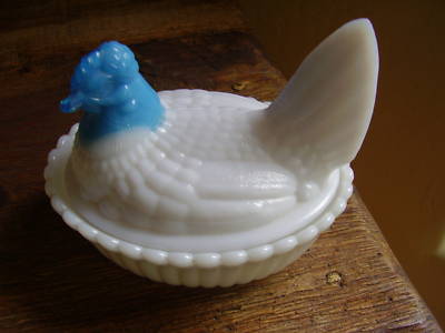 Antique Blue Face Comb Milk Glass Hen Chicken On Nest
