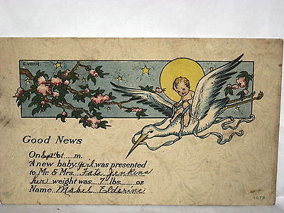 Title (ebay affiliate link): 1910 POSTCARD BABY RIDING STORK - MABEL ELDORINE JENKINS