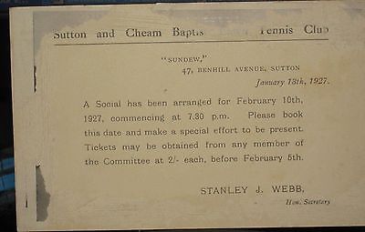 1927 TICKET POSTCARD SUTTON AND CHEAM BAPTIST LAWN TENNIS CLUB " SUNDEW " UK