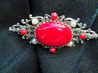 Vintage RED Milk Glass and Faux Pearls Brooch