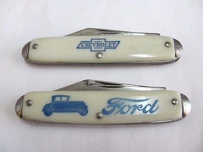 Title (ebay affiliate link): LOT OF (2) VINTAGE FORD & CHEVROLET DOUBLE BLADE POCKET KNIVES MADE IN USA