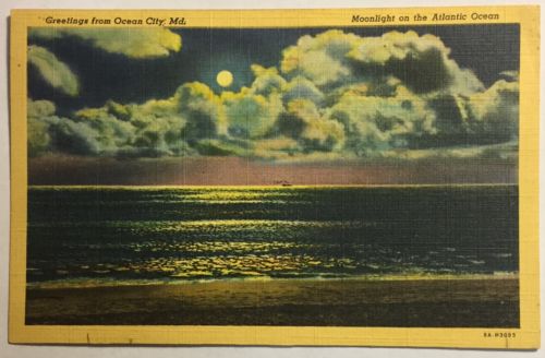 Title (ebay affiliate link): 1939 Greetings from Ocean City MD Moonlight on the Atlantic Ocean Postcard