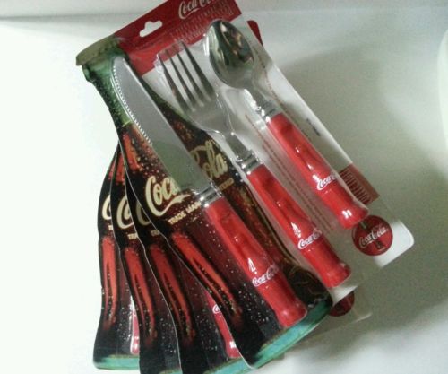 Title (ebay affiliate link): Coca Cola 12pc Flatware Set Red by Gibson (4 Unopened Packages w/ 3pcs in each