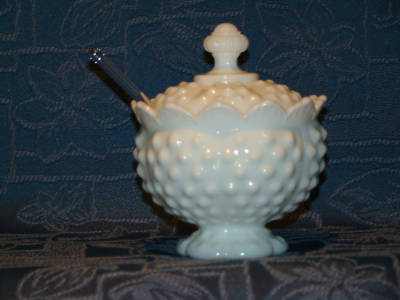 Fenton Hobnail Milk Glass Covered Jam Jar with Spoon