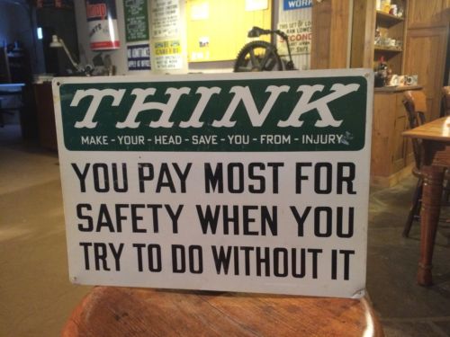 VINTAGE METAL "THINK" Safety SIGN, INDUSTRIAL - Factory - Steampunk Mancave