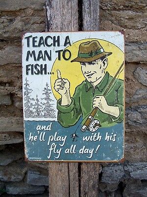 Title (ebay affiliate link): Funny Metal Fly Fishing Sign Retro Ad Wall Garage Bar Decor Plaque Mens Gift USA