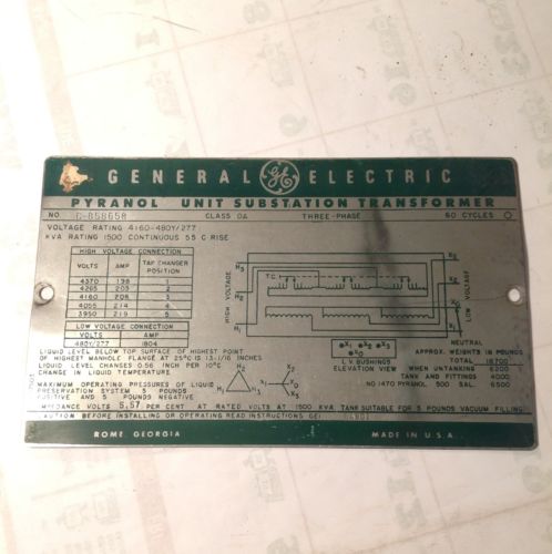 GENERAL ELECTRIC PLAQUE SIGN SUBSTATION TRANSFORMER