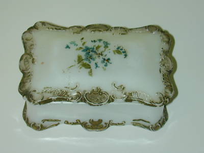 FORGET ME NOTS DRESSER TRINKET BOX VICTORIAN MILK GLASS