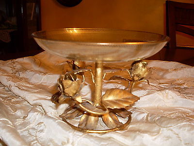 Hollywood Regency Italian Florentine TOLE Roses Gold Metal Candy Dish 1960's